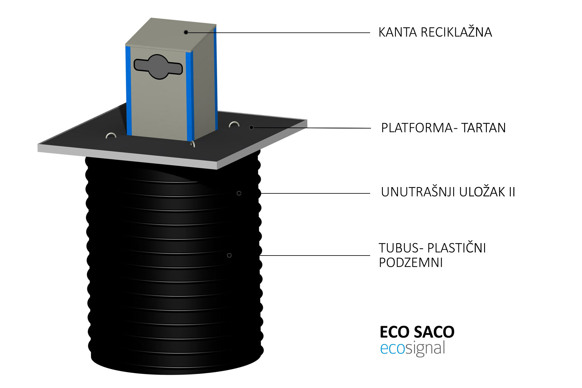 Podzemno plastično kućište kontejnera – tubus izrađeno je od polietilena visoke gustine, i u potpunosti je otporno na koroziju. Plastično kućište je prečnika 1600 mm i visine 2000 mm.